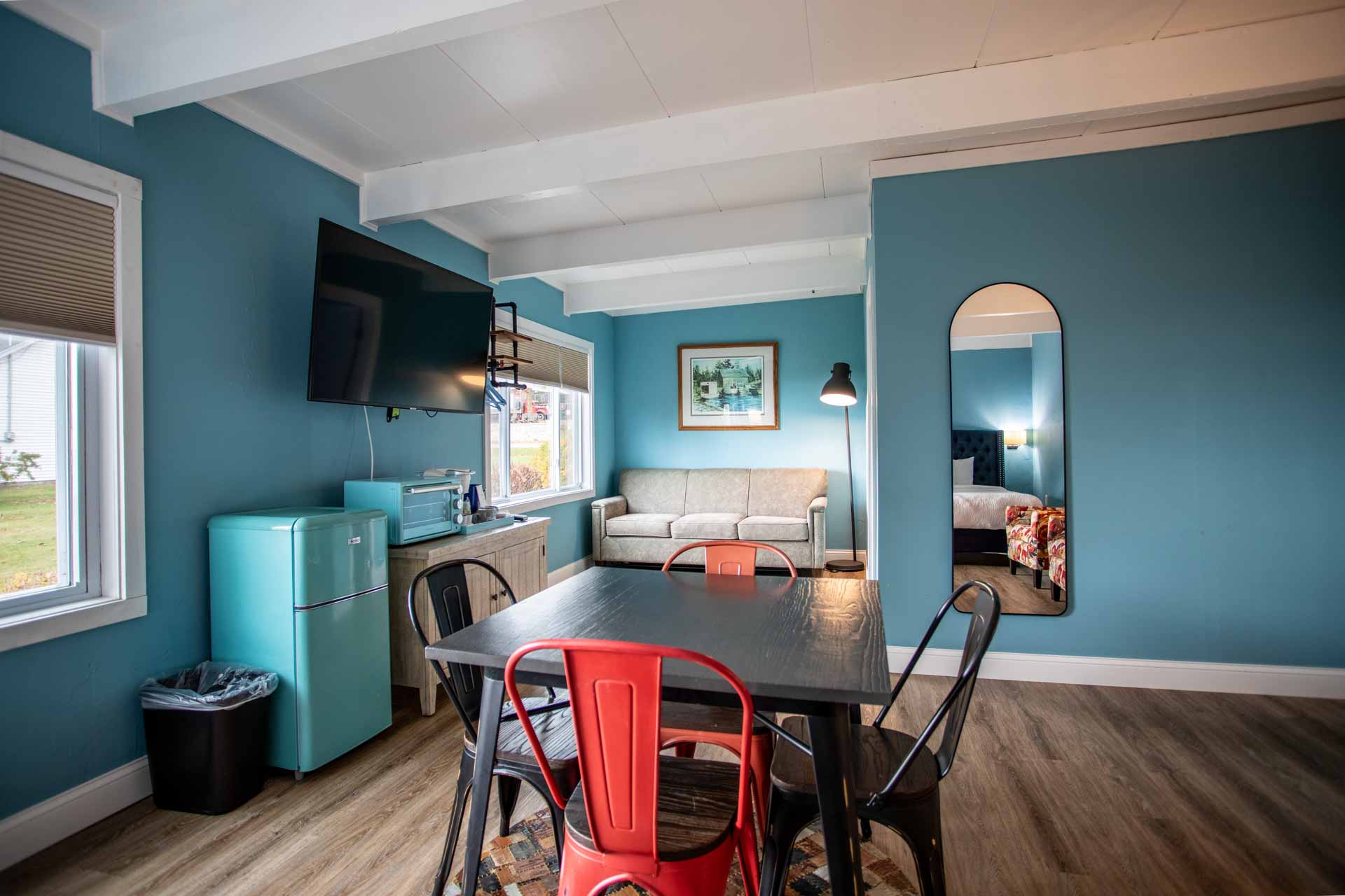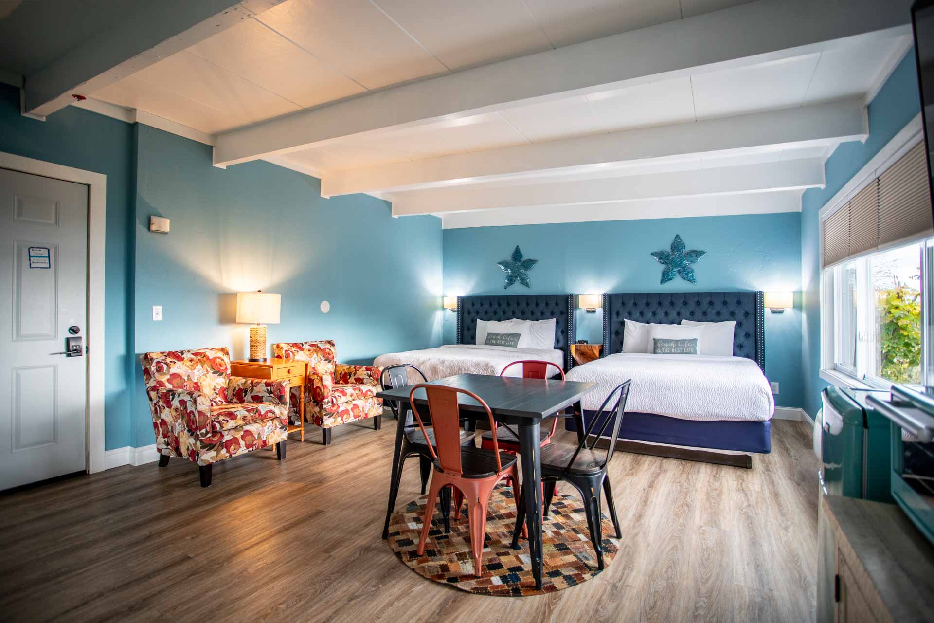 This large room has 2 Queen beds, a comfortable sofa sleeper, and a high-top table with room for 4. Bring whole family (including Fido) and still stretch out!